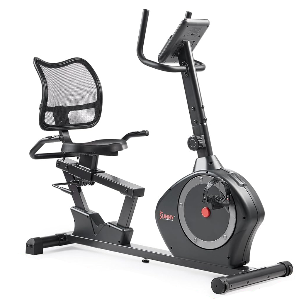 Sunny Health & Fitness Smart Heavy-Duty Recumbent Bike w/Wide Cushioned Seat & Back. Indoor Cycling Machine for Adult/Seniors Home Exercise. Free SunnyFit App Connect. Optional Workout Training Bands